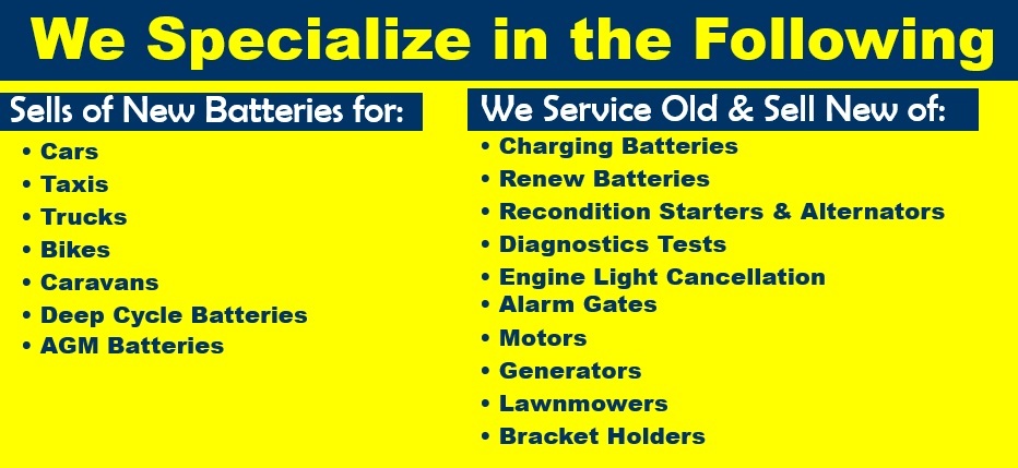 We supply all types of automotive batteries whether it be car, bike, truck, boat, jet ski, caravan, forklift, golf cart, deep cycle, alarm and even gate batteries. We have a wide range of sealed, semi sealed, silver calcium, high cycle and deep cycle batteries both new and second hand. Battery Xpress is a run business so customer service and satisfaction is guaranteed.